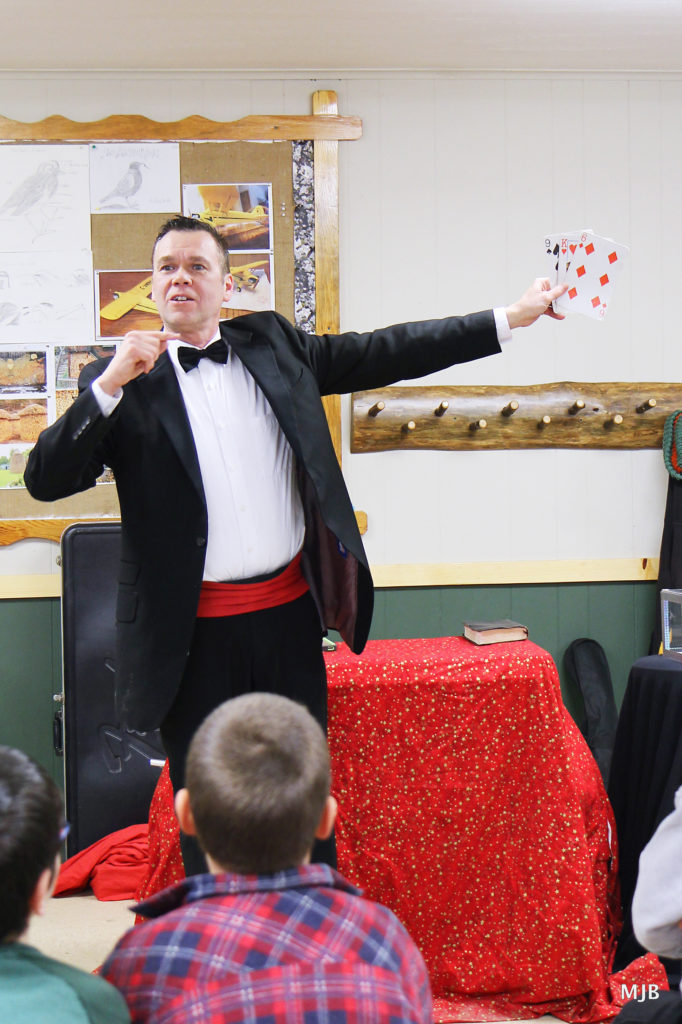 But by far the favorite part of the evening was watching our guest illusionist!  He kept us spellbound for two forty-five minute sessions with card tricks, magically pulling box after box out of an empty paper bag, and putting a pointed piece of metal through an inflated balloon.  Many of his illusions were an illustration of the way Christ is in our life, like taking our lives of emptiness and pulling out beautiful colors and gifts.  The most amazing was when two of our staff members handcuffed him with heavy metal chains and locked the chain just the way sin wraps our lives.  When they covered his hands with a red sheet to symbolize the blood of Jesus, he broke free of the chains just the way Jesus sets us free.  It was truly amazing to watch!